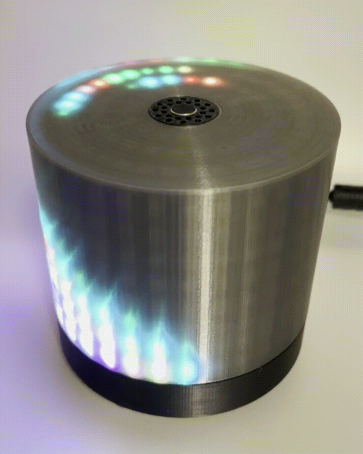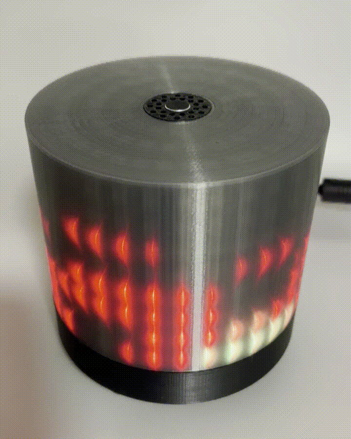 Pixelux - Cylinder contains three linear arrays of different lengths and an 8 x 32 matrix. No problem! A custom build of WLED was created to enable the 2D LED configuration, reactive audio microphone, pulse width modification fan and temperature sensor.