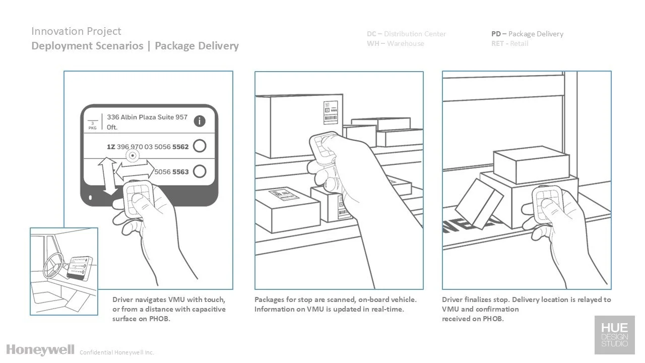 PHOB is ideal for distribution centers where multiple users provide input to fixed computers. PHOB also increases performance in the package delivery DE by freeing up the hands of the drivers and reducing device handling time.